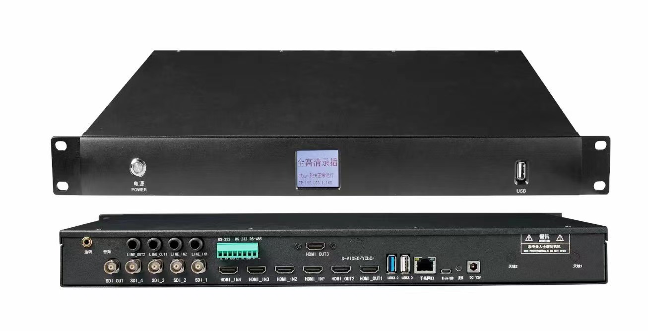 | 1.采用一体化硬件设计,嵌入式Linux操作系统,静音空气流散热设计,支持7*24小时工作,高度集成图像识别跟踪、导播、直播、点播、采集、录制等系统模块,易用易维护安全性超高; 2.支持B/S,C/S二种架构,登陆web端实现直播管理、信号管理、用户管理、文件管理、中控管理以及系统管理等功能,本地客户端实现导播与设置,方便实用; 3.支持4路HDMI(4*4K30)、4路SDI视频输入接口,3路HDMI和1路SDI输出接口,并且全部HDMI和SDI输入输出接口支持带音频; 4.支持8路高清H.265 IP流实时输入,支持8路网络摄像机输入,可实现含有音频和视频的网络流同步录制; 5.音频采用AAC高清编码方式,音视频精准同步录制;视频采用H.265编码方式,码率可调,支持视频编码512kbps~40Mbps,支持4K@30帧HDMI信号接入; 6.主机前置2.2英寸LCD屏,显示状态、IP地址等设备信息; 7.支持2路Line in立体声输入,支持外置音频或视频自带音频;支持2路Line out立体声输出,1路监听输出支持2路Line in立体声输入,同时支持HDMI和SDI视频自带音频;支持2路Line out立体声输出,1路监听输出。PGM音频录制可固定Line in也可选内嵌音频或固定8路预监画面其中一路的音频; 8.支持1个千兆RJ45网络接口,1个USB3.0、2个USB2.0和1个Miro USB接口; 9.支持2个RS-232、1个RS-485通信接口,方便扩展跟踪机、中控、键盘等各类外设; 10.支持输出TS/ HTTP/UDP/RTSP/RTMP多种网络流开展直播; 11.支持U盘备份、移动硬盘备份; 12.主机采用12V供电,安全可靠; 13.存储容量:最大支持单盘16T,标配1T硬盘; 14.可远程登陆录播主机系统,进行浏览查看,点播下载,配置等相关操作; 15.支持9个窗口显示,包含1路PGM画面和8路信号输入源预监画面; 16.支持对录制结束文件点播回放,可本地导播界面、web端或客户端软件观看回放视频; 17.支持对接自动跟踪图像系统,全自动导播跟踪系统图像,完成学生,教师等镜头智能切换; 18.支持多种画面布局,并支持不少于2种自定义画面布局;支持通道名称自由设置;支持字幕插入功能;支持透明台标,台标位置可调;支持片头字幕,片头图片,背景图片叠加; 19.支持电脑端安装导播客户端完成导播操作,电脑端导播软件可一键进入web端实现参数设置和文件管理;支持USB接口接入鼠标完成本地导播操作; 20.支持拍照功能,在录制过程中可以截取视频做为照片; 21.支持多通道同时录制,支持每路信号中的音频视频分别保存为单独的文件,支持最多同时录制8路独立含不同音频视频画面的信号; 22.支持调节音频信号大小和控制;支持控制远程云台摄像机,包含镜头移动,焦距调节,设置预置位等;支持相关视频参数设置,包含分辨率,码流,帧率等。 |